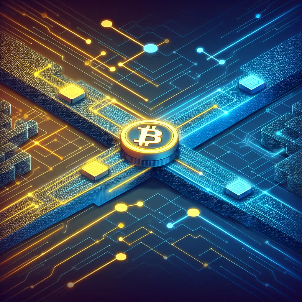 **SEO-optimized alt-text:** Digital illustration depicting Binance BNB token bridging into Coinbase ecosystem, featuring vibrant orange BNB symbol moving between two stylized, interconnected blockchain networks on a dark blue and midnight blue background, with a futuristic blue carpet pathway, highlighting crypto exchange interoperability, digital finance innovation, and trusted collaboration for a blog post.