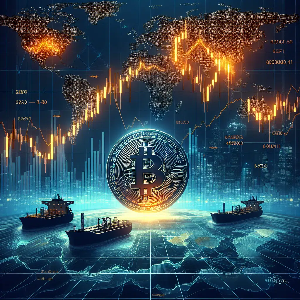 **SEO Alt-Text:** Sleek, professional illustration of a dynamic Bitcoin coin balancing on a volatile financial chart line with sharp spikes, set against a split backdrop of dark blue and orange symbolizing uncertainty and volatility. Faint graphics in the background depict global oil shipments, oil tankers near the Strait of Hormuz, and distant world landmarks, evoking geopolitical tension. Overlayed digital numbers and candlestick charts represent liquidity concerns, all unified with midnight blue accents for depth, capturing a modern, dramatic fintech aesthetic.