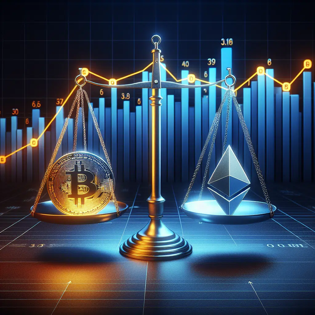 "Bitcoin and Ether coins on a digital scale, symbolizing the financial balance between the two cryptocurrencies. The background features a dark blue downward trend graph with orange and midnight blue arrows, denoting the outflows of 'US Bitcoin ETF's Record Losses' bold and in midnight blue color at the top."