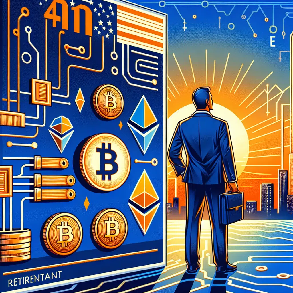 **SEO-focused Alt Text:** Digital illustration of a modern 401(k) retirement savings folder seamlessly blending with Bitcoin and Ethereum cryptocurrency symbols, set against a background accented with circuit and blockchain patterns. The design features bold orange, dark blue, and midnight blue colors, and includes a confident, diverse American worker gazing forward, representing secure and innovative future retirement investing, in a sleek contemporary fintech style.