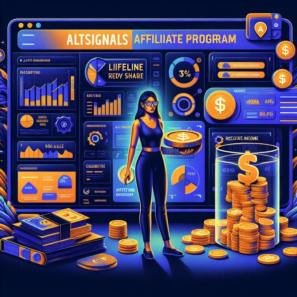 "Stylish affiliate dashboard with real-time reporting features, and marketing assets displayed on a dark blue screen. An influencer holding a '35% Lifetime Revenue Share' sign and representation of passive income symbols; coins in a jar, as part of the AltSignals Affiliate Program. Perfect for a WordPress blog post."