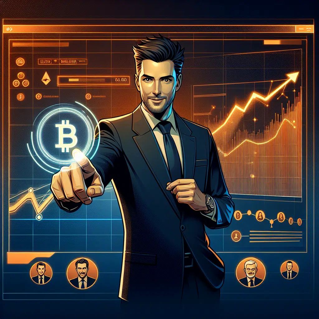 "Bitwise CIO Matt Hougan confidently illustrating Bitcoin's growth potential on a digital screen, with Harvard endowment, Abu Dhabi sovereign wealth fund, and individual holder avatars indicating widespread usage, in a digital world backdrop of brand-oriented orange and dark-midnight blue shades, alongside a subtly placed brand logo."