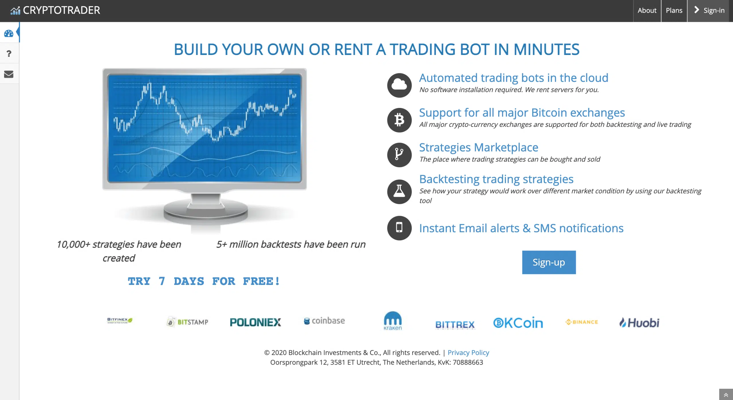 Crypto Trader is one of the oldest cryptocurrency trading bots in the cryptocurrency market right now. Users can start using the trading bot and could start enjoying the benefits of automated trading in just minutes. The cloud-based trading bot would let you create a wide range of strategies that would suit your needs.