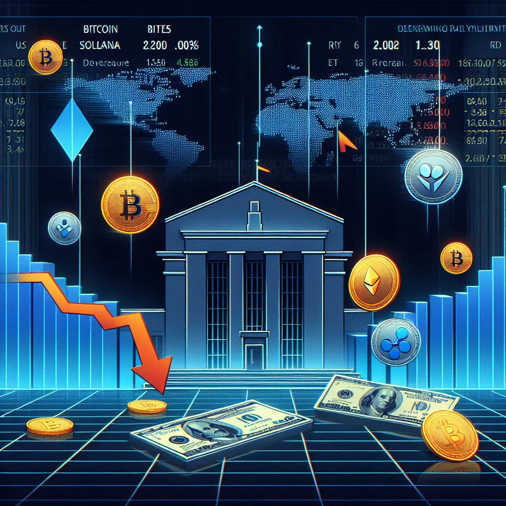 "Cryptocurrency market downturn image illustrating declining Bitcoin, Ethereum, Solana, and Ripple coins with red arrow against a dark blue Federal Reserve building background, overlayed with a whitish transparent loss graph and orange title 'Crypto Market Deepens Losses: Fed's Unchanged Rates & Raised Inflation Forecast Impact', addition of a subtly faded midnight blue global map symbolizing worldwide impact, dimensions 1200x628"