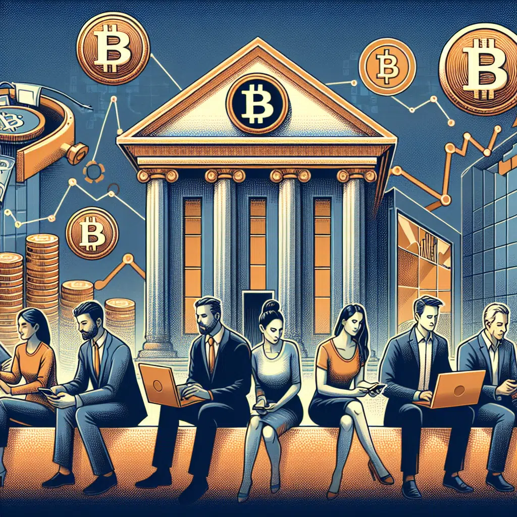 "Diverse group of young people trading cryptocurrency on digital devices, graphically represented by digital coins and growth charts, in contrast with older individuals confidently transacting at traditional banks represented by classical buildings; done in orange, dark blue, and midnight blue color scheme. Background subtly features safety cue and legal symbols indicating security, regulation, and protection."