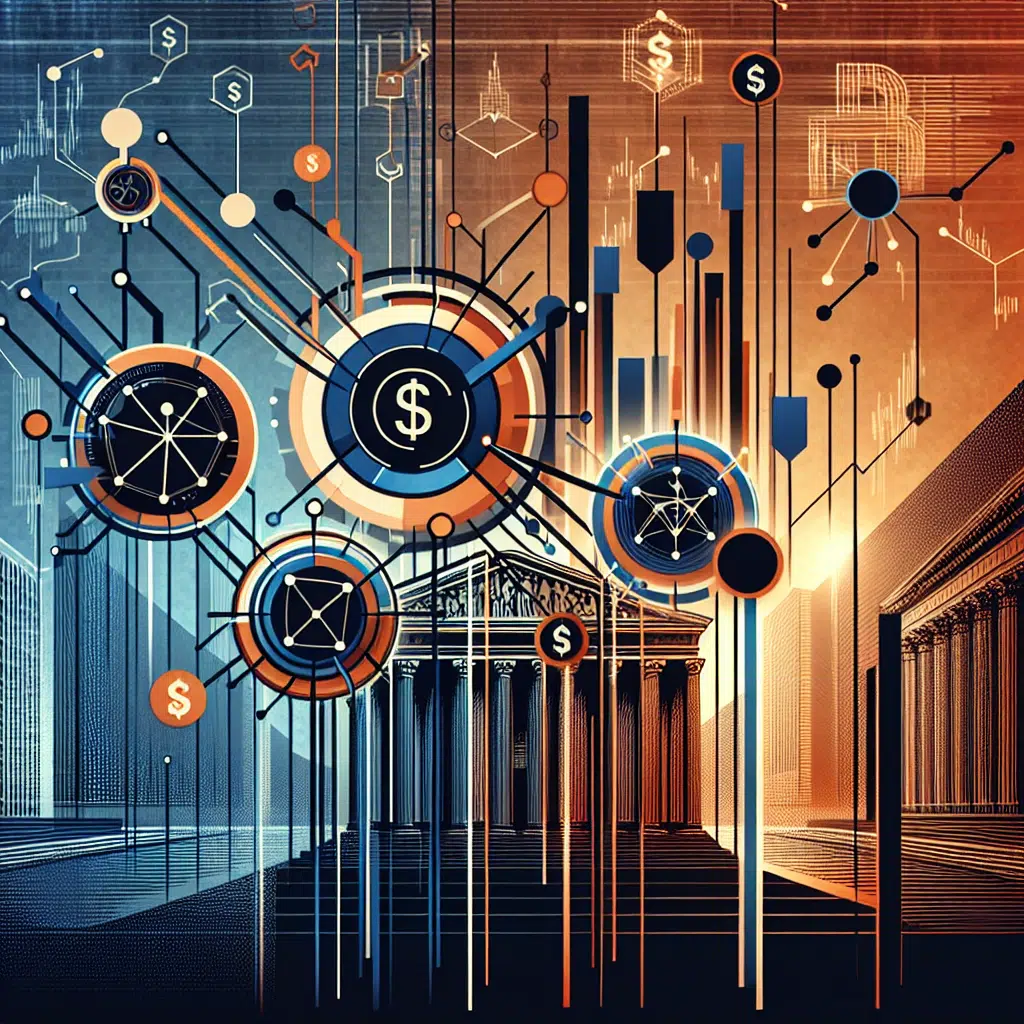 SEO Alt-Text: Digital illustration depicting abstract icons for the Magnificent Seven tech companies—Apple, Microsoft, Alphabet, Meta, Amazon, Nvidia, and Tesla—as interconnected pillars radiating from a central hub. The background features subtle AI motifs like circuitry and neural networks, alongside stock market graphs, a silhouette of the Federal Reserve building, and dollar symbols to emphasize economic and policy themes. The sleek, modern design uses a color palette of vibrant orange (#FF9811), dark blue (#000D43), and midnight blue (#021B88) with clean gradients and geometric shapes for a forward-looking, high-tech feel, symbolizing tech earnings, market leadership, and economic influence.
